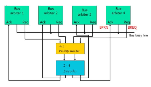 It uses an external priority encoder and decoder. Each bus arbiter has a bus request output line and a bus acknowledge input line. Each arbiter enables its request line when its processor is requesting access to the system bus. The processor with the highest priority, as determined by the output of the decoder, gains access to the bus.