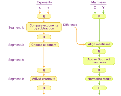 The floating-point addition and subtraction process is broken into four stages. The corresponding sub-operation to be executed in the specified pipeline is contained in each stage. The four stages perform the following sub-operations: