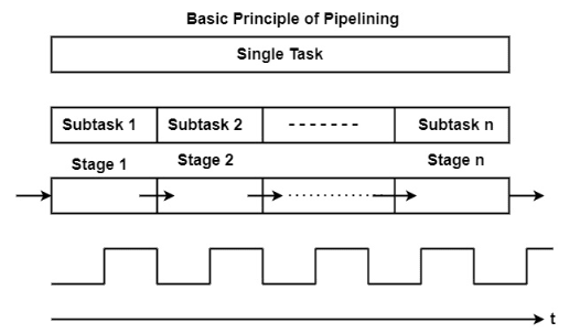 Each task is subdivided into multiple successive subtasks, as shown in the figure. For instance, the execution of register-register instructions can be broken down into instruction fetch, decode, execute, and writeback.